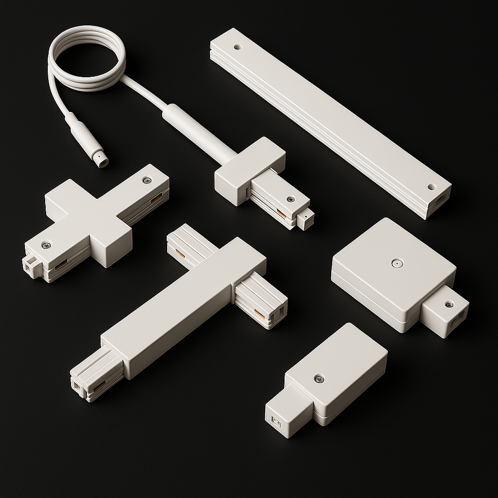 Essential components for modern LED track systems, including connectors, adapters, end caps, and suspension kits.